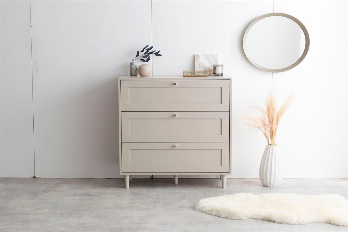 品のある框(かまち)デザインと柔らかなニュアンスカラーが印象的な『Calan(カラン)』シリーズのチェスト