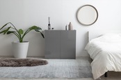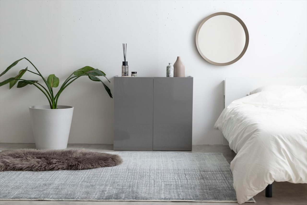 【グレー】本体:パーティクルボード、天板・側面:メラミンシート貼り、扉:鏡面貼り