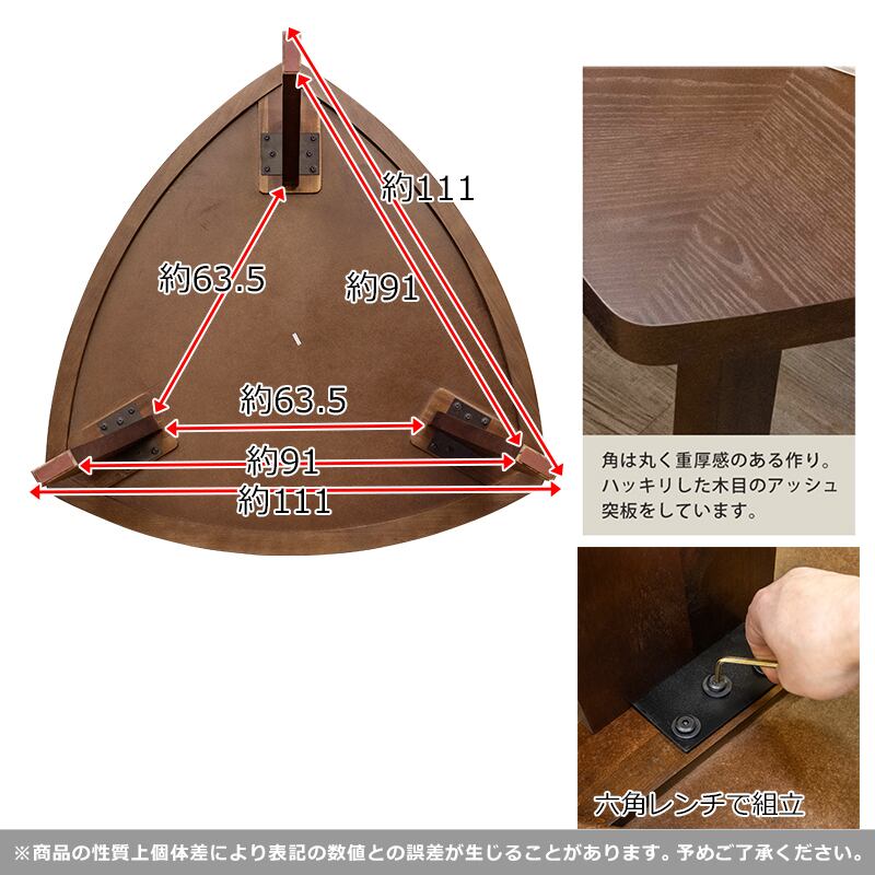 緩やかな三角形天板、重厚な木目柄天板となっています